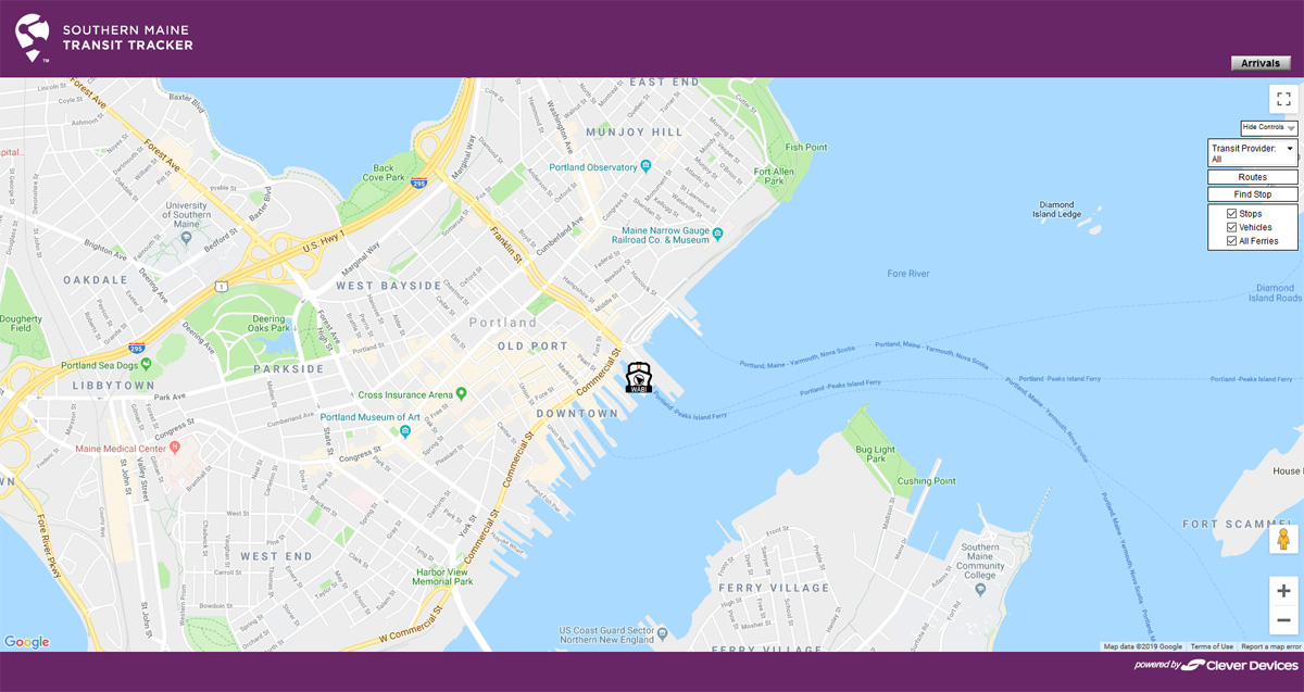The Southern Maine Transit Tracker (SMTT) is a ride tracking system released by Casco Bay Lines (CBL) in partnership with Metro and South Portland Bus Service. Computer and GPS devices installed onboard all CBL ferries provide real-time and predicted arrival information to riders. The real-time Map is SMTT’s interactive web map that riders can use to track CBL vessels sailing on Casco Bay, and view estimated time of arrival (ETA) and “next stop” information for all vessels on a regularly scheduled trip. Although this map can be accessed on a mobile phone using a 3rd party mobile app it is more useful when viewed on larger devices such as tablets, laptops and desktop computers.